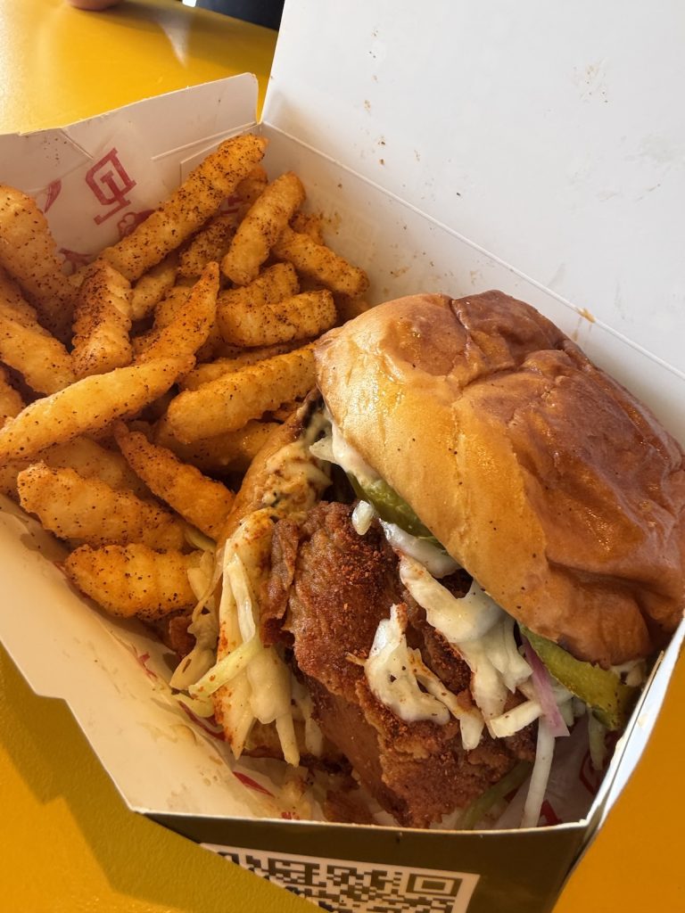But back to the chicken. I’m taking bites of the Nashville-style OG Chicken sandwich and hanging off Doug’s every word when the extra hot sauce starts to kick and I start to imagine what it might feel like to be on the Hot Ones set. like, I’m trying to focus because Doug has a great tale to tell but the sauce is so good that my brain keeps distracting me with it.